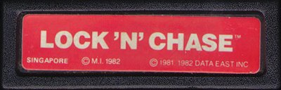 Origin lower right; © I.I. 1982 to left of origin; ™ small, centered to right of game title; smaller label, rounded corners; © 1981, 1982 Data East U.S.A., Inc. upper left |