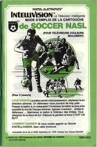 French edition; game title FOOTBALL (though SOCCER is mentioned parenthetically); no NASL logo; green artwork; mentions 'Mattel Electronics France' in lower left corner; special thanks to Intellivotion |