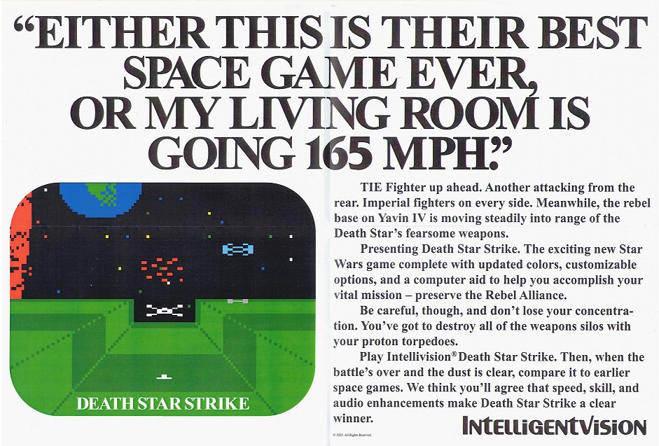 HB | Admit it, when Mattel released Star Strike, just about everyone saw it as a Death Star trench game; Intelligentvision makes this come true! This game addresses the issues in the original release and amps the action; initially released in a Parker Brothers-inspired packaging at PRGE 2025 with a cool poster, this game brings it! |