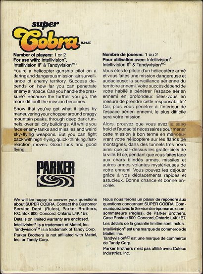 Seems that French-Canadian copies use the Parker Brothers Atari 2600 label on an Intellivision cartridge; no origin listed; © 1983 |