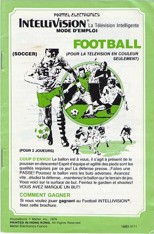 French edition; game title FOOTBALL (though SOCCER is mentioned parenthetically); no NASL logo; green artwork; mentions 'Mattel Electronics France' in lower left corner; special thanks to Intellivotion |