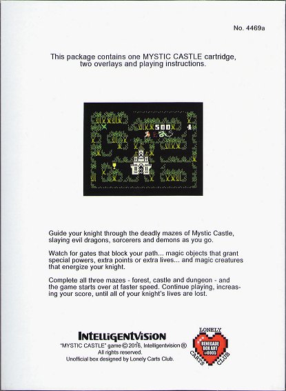 Custom box from Lonely Carts Club great for storing a your fully assembled copy of Mystic Castle; box is lined with artwork reminiscent of the demon level in the game; has great cartridge and manual retention system as well; Lonely Carts Club log on back |
